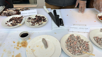 When we went up for breakfast this morning at seven, we found ourselves facing the hills of Kap York, Greenland on a very grey, windy, wet and foggy day. It looked pretty grim out there and not very inviting for a landing and hike to the glacier as planned. As we ate our expedition leader came on the intercom and announced that they had cancelled this landing. At first, I thought it was because of the rain, but as he explained it was because of the fog and the lack of visibility which made it impossible to set up our bear guard perimeter. This consists of a group of people with rifles staked out around the area they propose us to be. We are not allowed to land anywhere without it. The danger of polar bears is just too much of a threat. So, we set sail south and cruised past a series of incredibly beautiful icebergs on our way to our next destination. Plan B, the Greenlandic Film Festival hosted by David Reid. It consisted of three films all less than 10 minutes long. The first film was called ‘Greenland – Another World … Yet So Close’. The film explained and bemoaned the disappearance of the culture of hunting and dog sledding. The second film was called ‘Passing It On’, and focused on a grandmother who was upset that she cannot pass on her knowledge of dogs to her grandchildren. The third was ‘The Hunter’ about one young man who has inherited his grandfather’s hut, never learned to read and write and has chosen to be a hunter. All three movies were about the changing nature of the culture in Greenland. When we were in Qaanaaq I noticed that there were dogs all through town. But, I also heard that there were many more in a large pen outside of town. Dogs and sledding goes to the heart of their cultural identity, but things are changing. The young people are being better educated and encouraged to stay in school and many adults now have full time jobs where they are expected to be at work for a regular workday. The dogs are very noisy neighbours that interfere with people’s sleep. Therefore, they are being moved to the outskirts of the towns. There used to be twice as many dogs in Greenland as people, but they are now in decline as people move on to other jobs. The dogs are not pets, they are wild dogs and work animals. It was interesting watching the hunter running his dog sled, as the dogs run in a fan hitch formation rather than the two-by-two-by-two dog teams that we are familiar with. This is because up here there are no trees to navigate around, and the dogs can just run as a pack. The hunter explained that he prefers dogs to snowmobiles because dogs don’t break down and snowmobiles always do. Dogs also have eyes and ears for spotting prey and run faster when on a fresh scent and they sense weak or dangerous ice, unlike snowmobiles. Greenland dogs will eat each other if necessary whereas Alaskan dogs won’t. Next up was James Raffan talking about his life and experiences in the north and his book ‘Circling the Midnight Sun’. He is a very literate, articulate, and engaging speaker. He has lived an incredibly rich life of adventure and exploration. He was inspired by Michael Palin’s travels, including one where he circled the globe along the equator; so, James decided to travel through the north along the Arctic Circle. It took him three years to travel through, Iceland, Greenland, Canada, Alaska, Russia, and Norway. I talked to him about that, and he said Palin obviously had a large budget provided by the BBC and a full team scouting for him and filming his every move, whereas James had to return home a few times to make enough money to continue. I also asked him about buying books as opposed to Kindle, and he told me he does as well or better with Kindle purchases. That made me happy, as that is my chosen method for reading two of his books. JR showed a short video made by a group of students in the north called: Two Breaths, One From the Ocean. It was an in-your-face public service announcement about climate change and telling people to get on with it and deal with it. Dylan White was up for the last presentation about ‘Arctic Predators’. He was introduced as a ‘professional environmentalist and consummate guide’. He spoke of the four family types of land-based predators in the Arctic: bears, weasels, cats and dogs. All three types of bears are present in the Arctic, black, brown and polar, and their ranges do overlaps at some points, but the black bear is at the southern end of the area and the polar bear is at the more northern end. Weasels are represented by the incredibly tenacious wolverine which is afraid of nothing and will challenge bears and wolves; and the ‘psycho-killer’ ermine, which is a small carnivore about the size of a small squirrel. It will take down Arctic hares that are much larger than itself and will chase lemmings through their tunnels under the snow. The only cat in the north is the lynx which lives on Arctic hares and can leap from the snow into trees to grab squirrels. The dog family has three members here: the red fox, the arctic fox and wolves. The red fox is a very successful animal and is spreading further north each year with climate change. The Arctic fox is camouflaged in winter white and lives by following polar bears and eating their leftovers, but in the spring and summer changes to a grey or brown colour and will hunt lemmings, birds and eggs and any other small prey. Wolves of course are very successful because they hunt in a pack and can therefore take down prey much larger than a single wolf could manage. Good presentation with some excellent photos. Then we had lunch. After that there were a number of workshops that I wasn’t really interested in, and I decided to go to the room and type up my blog stuff. Bruce was there reading, but he fell asleep, so I turned off the light for him, and I fell asleep shortly after. We were woken up an hour later by Scott’s announcement that there was ‘country f