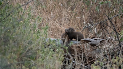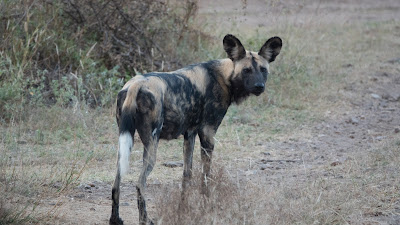 This morning was a fantastic morning drive! After the 24 hours of game drives on the weekend, I had thought of perhaps skipping this morning’s and staying in the camp to update the blog about the Kruger trip, but I am exceedingly glad I didn’t. Today it was just the boys, Matt, Bruce, Koert and I with Heidi as our guide, the girls were all in a different truck. It rained overnight and the road were a bit wet and muddy. Shortly after crossing into Buele Reserve we found the wild dogs, walking down the road in front of us! This was the pack of three dogs we had briefly seen three weeks ago. They were aware of us and kept looking back at us, but were clearly on a hunting mission. They walked together or fanned out to scout the area as we followed. A couple of times they trotted off into the bush and we thought that was it, but they came back to the road. One time they came out running towards us which was amazing and we got better photos from the front. Animals seem to like the man-made paths as they are easier to walk or make time. Heidi alerted the other two game viewers, and they joined us. We switched places a couple of times to try to give everyone the best sightings. We saw a few impala pronk (a jumping display they do to show how fit they are) in alarm at the sight of the dogs, and a group of baboons went crazy yelling and calling while running away or climbing trees. This is why we all came to Africa, we wanted to see predators and prey in action. I wasn’t sure if I really wanted to see them catch an impala, as they are beautiful animals, and to watch them get caught and ripped apart would be hard to watch. Unlike lions and leopards, dogs do not have the ability to deliver a killing bite to the throat. Instead, they grab it and hold on until the rest of the pack arrives. Then they rip it apart. In the long run we were spared that as they finally ran off into the bush and we lost them, or they lost us. We were with them for well over an hour! I have seen African dogs in Kruger a few years ago, but they were just laying by the side of the road relaxing. Easy to photograph but no action. This time, lots of action and very hard to photograph. However, out of the many I took, I did get some good ones. We stopped for a coffee break at that point, at the same spot where we came across the buffalo last Friday. Again, we walked down to the river and found fresh leopard tracks, but no cat and happily, no buffalo. We saw a large crocodile with its mouth open warming up in the sun, and the beautiful large saddle backed stork, both on the shore and in flight. We also saw an elephant crossing the river. When we continued, we saw a pearl spotted owlet, two brown hooded kingfishers, many flying vultures and eagles, and the usual herbivores: giraffe, kudu, impala, water buck and an elephant using its trunk to reach branches well above its head and rip them off. Koert said it best when he said he was on a photographer’s high… What a great morning drive! Back to camp for lunch. Then we had a debriefing with the powers that be here about our Kruger trip, because Timo and Koert complained about the driver/guide Andrew and about the shoddy arrangements of booking a camp that far away and not leaving early enough to get there without driving like stink. In the afternoon we had our last gin drive. On route we saw kudus, a yellow-billed hornbill eating a worm, a colony of dwarf mongeese, waterbuck, vervet monkeys and elephants. We found one along the rail tracks that cross the reserve. It was in a deep crevasse that was made for the train tracks to go through a hill, which is scary because wildlife is sometimes killed by the trains and earlier in the month we had been at a spot where a dead elephant had been put for the scavengers to eat. Anyway, we tried not to think of that outcome and instead enjoyed watching as he demonstrated how high he could reach to strip leaves and branches off trees. On the way back we saw a Verreaux’s eagle owl, and after trying a few different settings I got a couple of good photos.
